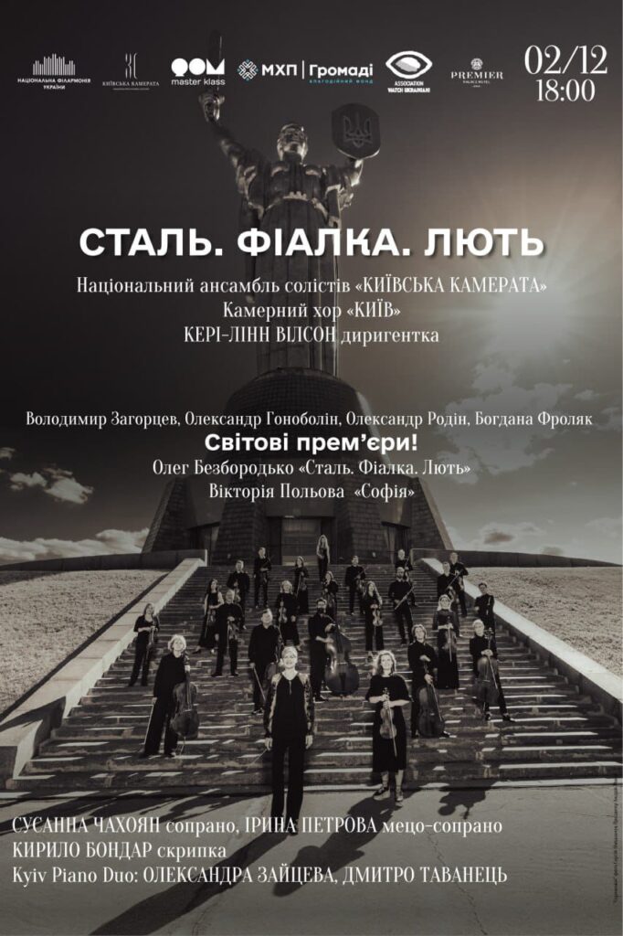 2 грудня о 18:00 у Національній філармонії України відбудеться концерт «Сталь. Фіалка. Лють» під орудою відомої диригентки українського походження Кері-Лінн Вілсон та за участю двох провідних українських колективів — Національного ансамблю солістів «Київська камерата» та Камерного хору «Київ».