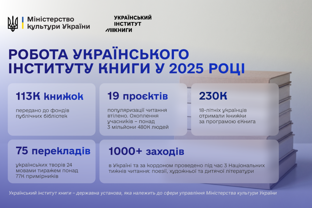 Український інститут книги завершив 2025 рік з вагомими результатами: 113 тисяч нових книг для бібліотек, 75 перекладів українських творів, 19 проєктів з популяризації читання та участь у шести ключових міжнародних книжкових ярмарках. Український інститут книги — державна установа, яка належить до сфери управління Міністерства культури України.