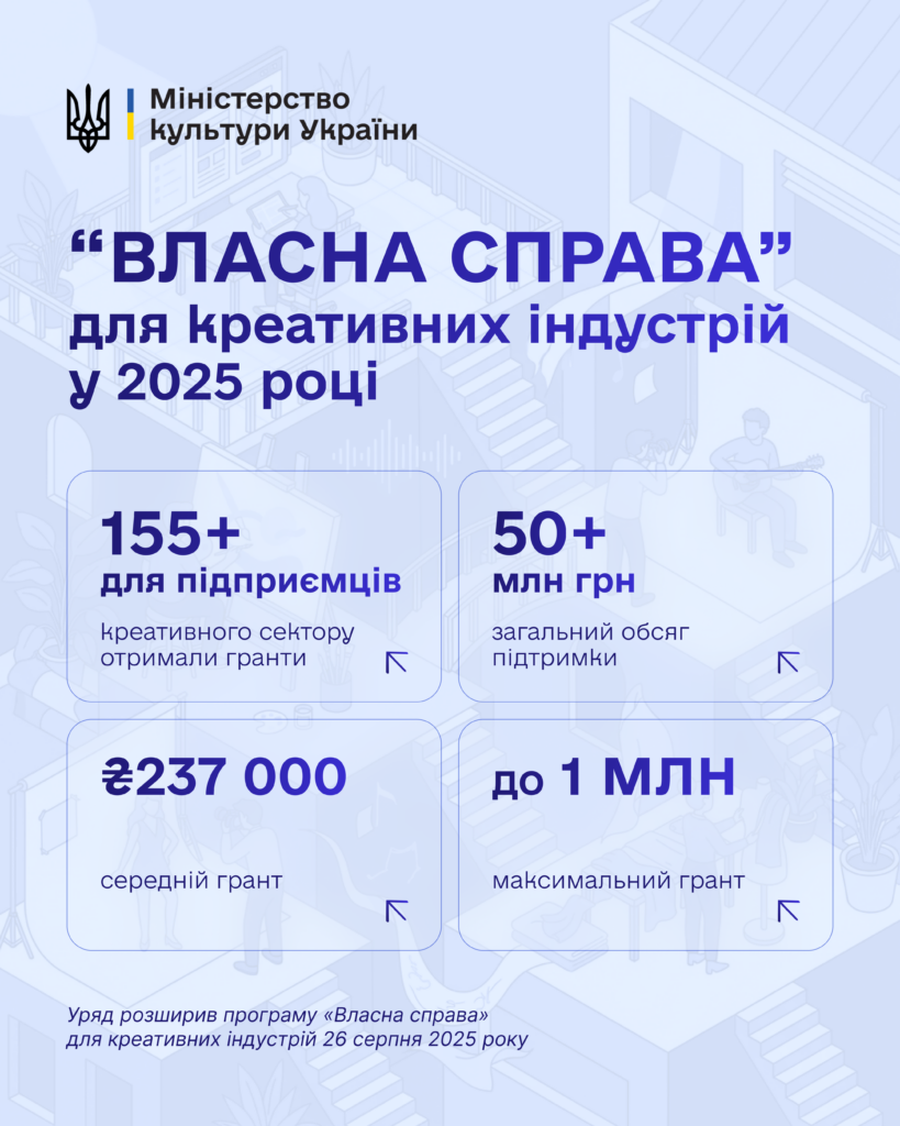Нагадаємо, з 26 серпня Уряд розширив програму «Власна справа», запровадивши нові можливості саме для креативних індустрій. Відповідну постанову розробило Міністерство культури України. Вона передбачає збільшення максимального розміру мікрогрантів та розширення переліку витрат, які можна покривати за рахунок державної підтримки. Зокрема, грантові кошти дозволено спрямовувати на специфічні творчі послуги — редагування текстів, обробку аудіо- й відео, постпродакшн, виплату роялті.