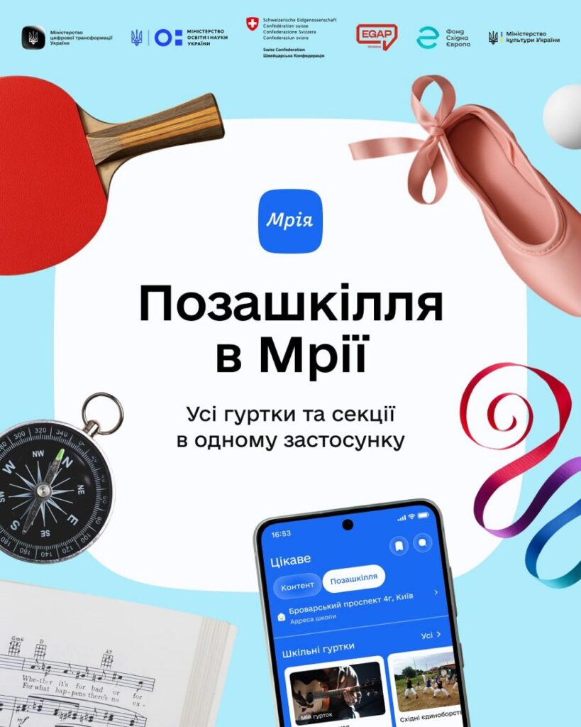 Відтепер зробити це можна за кілька кліків у застосунку Мрія. Платформа об’єднує інформацію про тисячі гуртків по всій країні — від мистецьких і спортивних до технічних і наукових. Користувачі можуть переглянути розклад занять, локації та в майбутньому отримати персональні рекомендації відповідно до інтересів дитини.